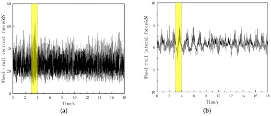 To analyze the dynamic response of the train passing through the beam-end expansion area, the refined analytical model established in Section 1 was only added with random irregularity as an excitation, without considering the bridge deformation caused by temperature changes. The beam-end expansion area is highlighted with a yellow box in Figure 8.
