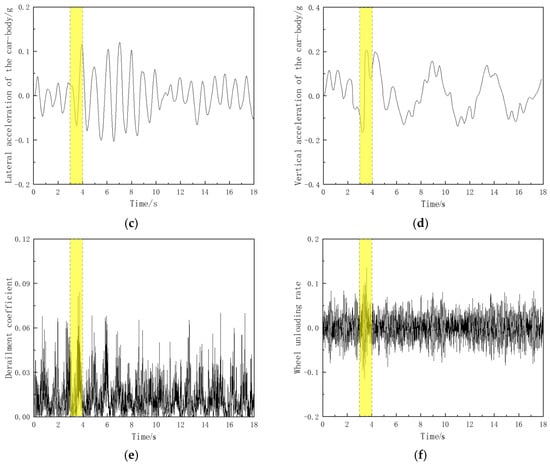 Dynamic response of vehicles under no temperature induced beam end deformation as (a) wheel–rail vertical force; (b) wheel–rail lateral force; (c) lateral acceleration of the train body; (d) vertical acceleration of the train body; (e) derailment coefficient; (f) wheel unloading rate.