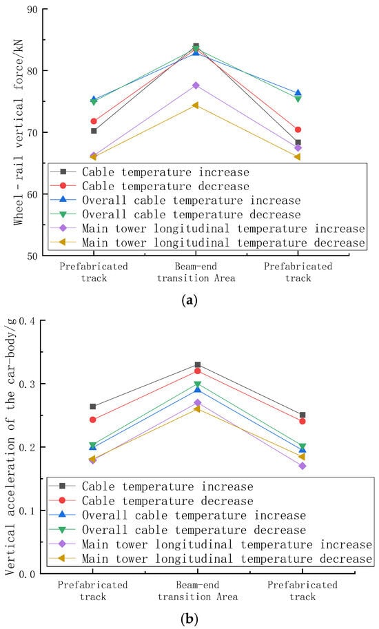 Compared to the scenario where only random irregularities were considered as excitations, both the vertical acceleration of the train body and the wheel-rail vertical force in the beam-end area of the long-span cable-stayed bridge increased significantly under the said six temperature load conditions. Notably, under the condition of overall temperature decrease, the wheel-rail vertical force and the train body’s vertical acceleration changed the most, by 21% and 57%, respectively. This implied that the vertical dynamic response of the train at the beam ends was greatly affected by temperature variations. No remarkable changes were demonstrated in the train body’s lateral acceleration, the wheel-rail lateral force, the wheel axle’s lateral derailment coefficient, and the wheel load reduction rate. Under the conditions of overall temperature increase and decrease, the comfort indicator of the train changed from excellent to good. In general, the dynamic response of the train at beam ends under temperature loads is primarily influenced by vertical deformations. The dynamic response indicators of a train in the beam-end expansion area of a long-span urban rail bridge are controlled by the effects of overall temperature decrease.