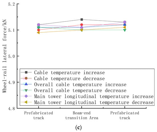 (a) Dynamic response of vehicles in the beam end transition area for wheel–rail vertical force. (b) Dynamic response of vehicles in the beam-end expansion area for vertical acceleration of the train body. (c) Dynamic response of vehicles in the beam-end expansion area for wheel-rail lateral force.