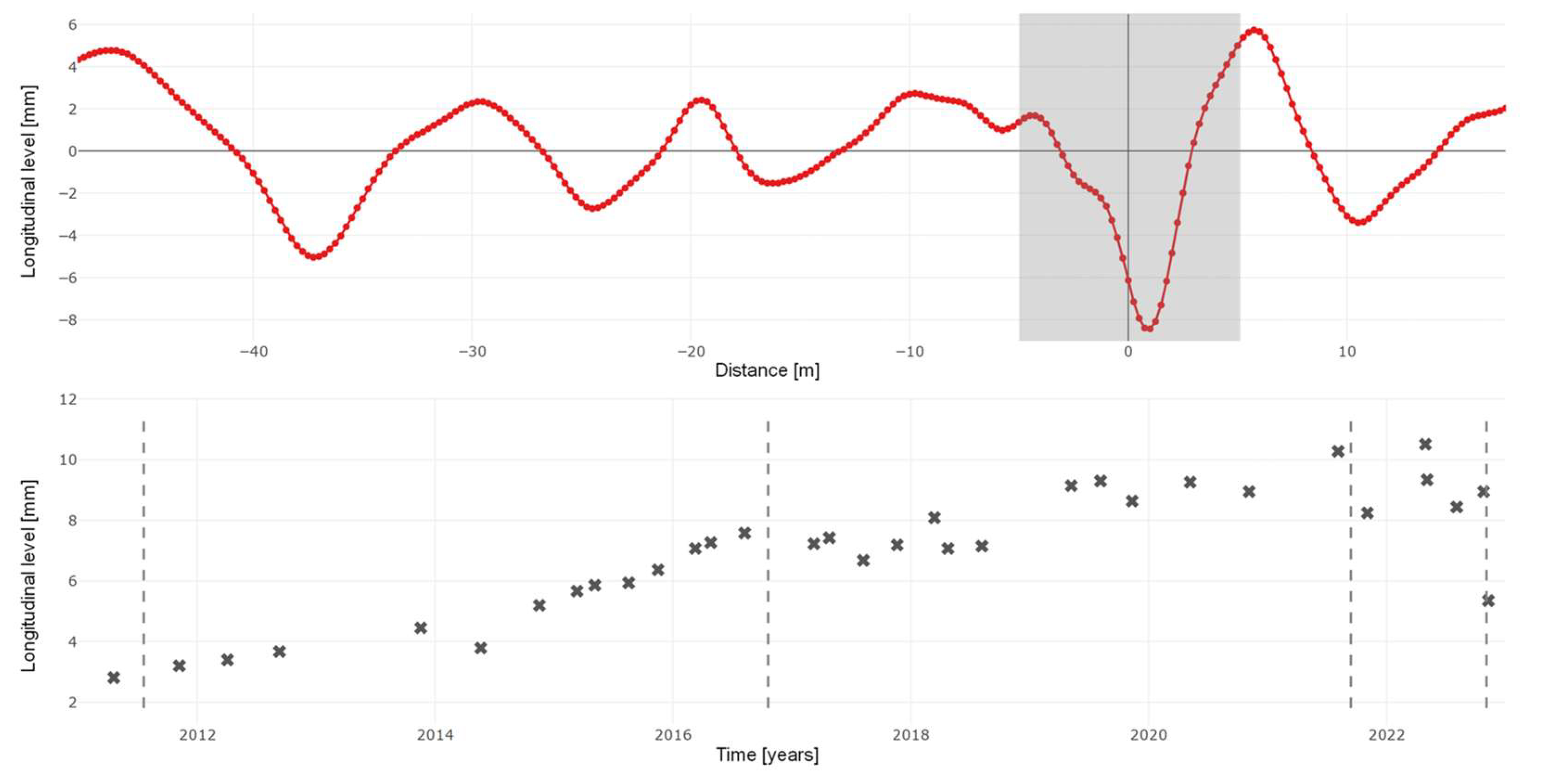 The upper half of the figure shows the longitudinal level expressed spatially. The frog area is highlighted by a grey rectangle. An isolated failure of the track geometry (local settlements) is clearly visible in this area. The lower half shows the deterioration of the longitudinal level of the highlighted area. To perform time series analysis, we utilised maximal zero deviations of the longitudinal level as the quality indicator, as defined by regulatory guidelines. Local settlements are increasing over time, as the indicator demonstrates. Historical maintenance actions are illustrated as vertical dashed lines. Tamping in 2011 had a positive effect on the longitudinal level of the entire turnout, but as there were no severe isolated failures in the frog area, tamping had no effect on the frog. By the end of 2017, no significant reduction in failures had been achieved, but the system had stabilised to some extent, with a lower rate of deterioration after tamping than before. In 2021 and 2022, only local measurements were carried out on the frog instead of tamping the whole turnout. No data is available on the type of maintenance carried out, but this example is consistent with experience and shows that local measures are rarely sustainable.