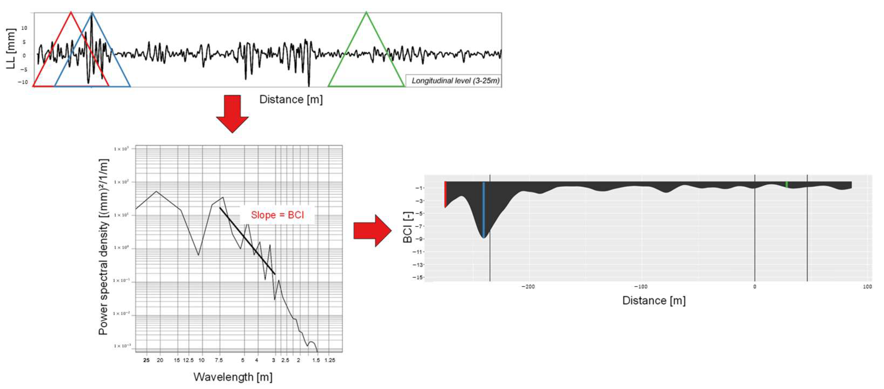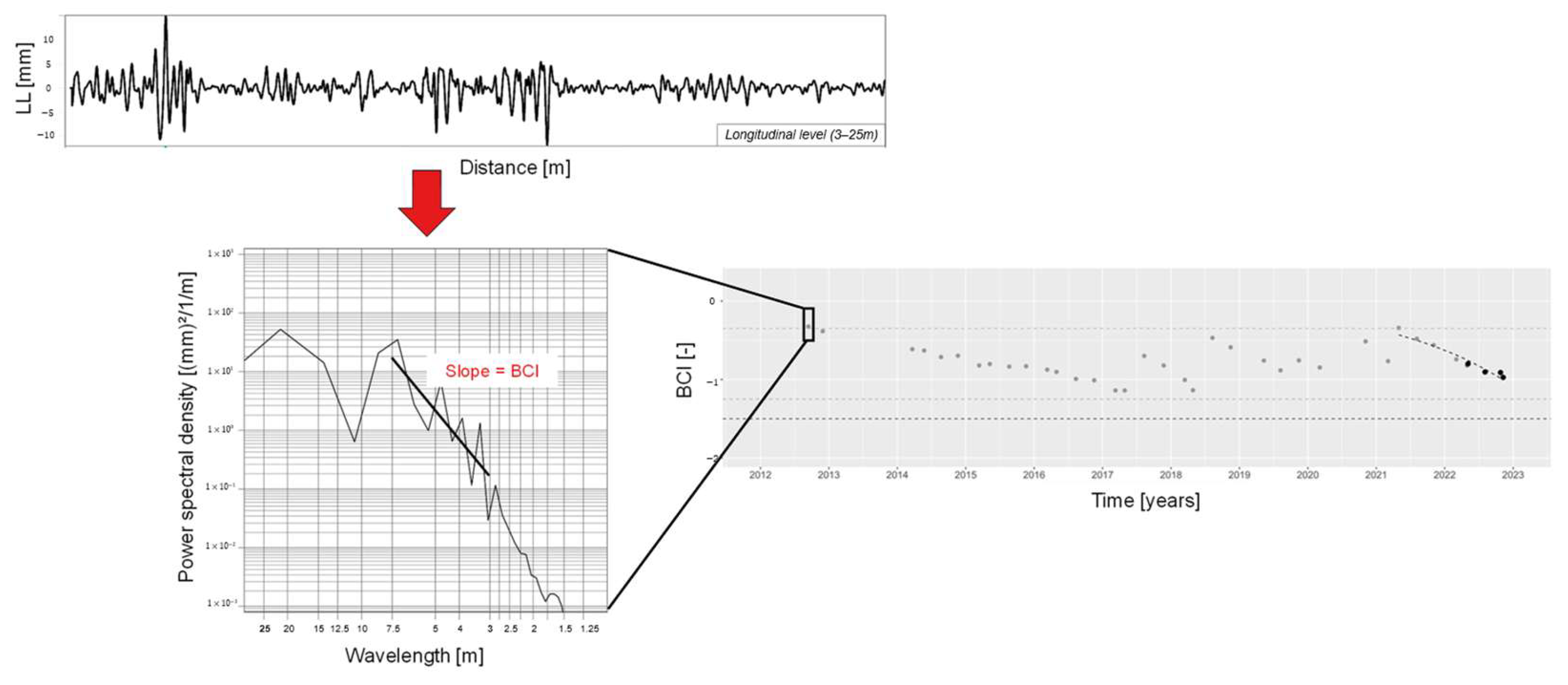 32]. Two aspects must be considered. (1) In order to nullify the impact of the measurement speed (in this case the speed of the regular locomotive), double-integrated axle box acceleration has to be dived by the squared measurement speed. (2) As integration results in long-wave drifts of the signal due to measurement noise, a method must be implemented which deals with the noise. This phenomenon is well known and often discussed in the literature [