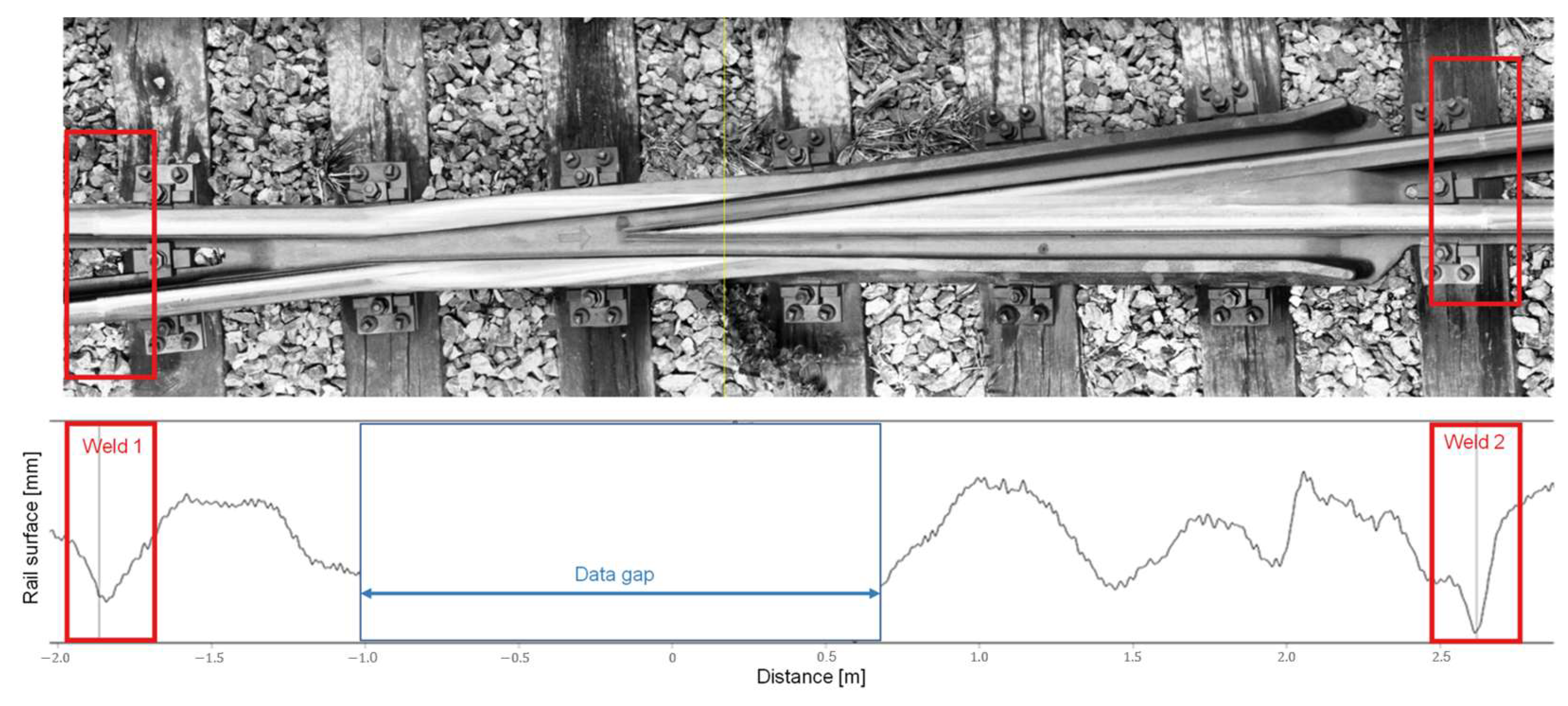 Figure 5 pictures the welds of a frog and depicts relevant rail surface signal characteristics.