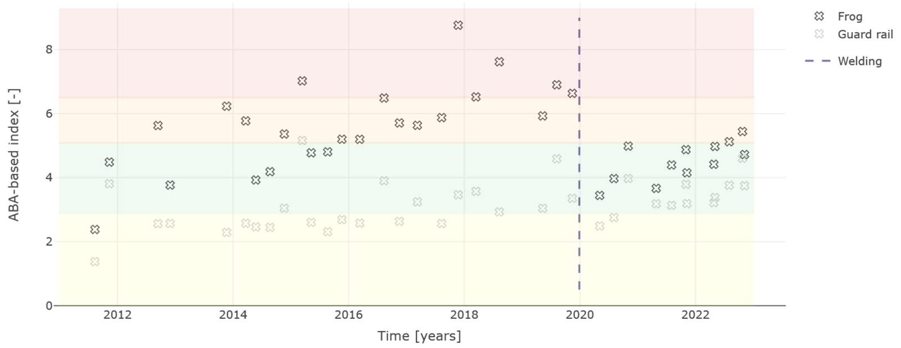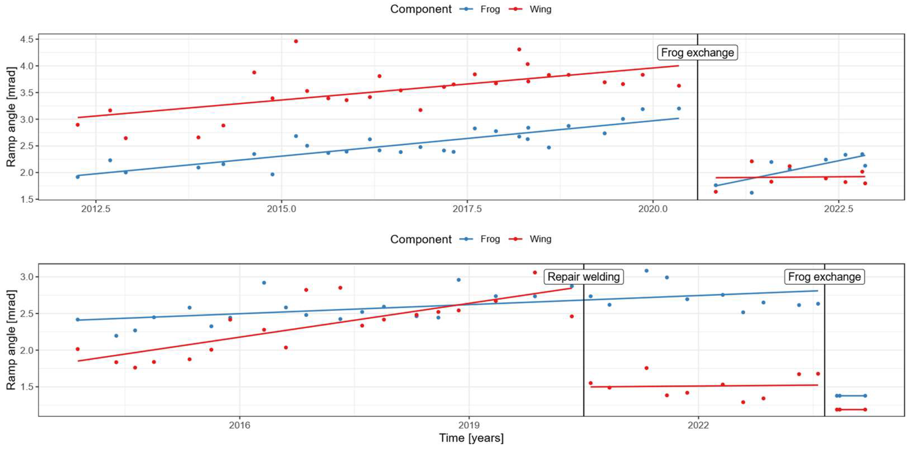 Figure 6), there is a clear linear deterioration trend for both welds from 2012 to 2020. The rate of deterioration is the same for both welds; however, the weld on the side of the wing rail started with a larger ramp angle in 2012. In 2020, the frog and therefore the welds were replaced, resulting in a significant reduction in the ramp angles. After the replacement, the weld on the side of the frog started to deteriorate again. To date, no deterioration has been observed in the wing rail side weld. The second example (lower graph in