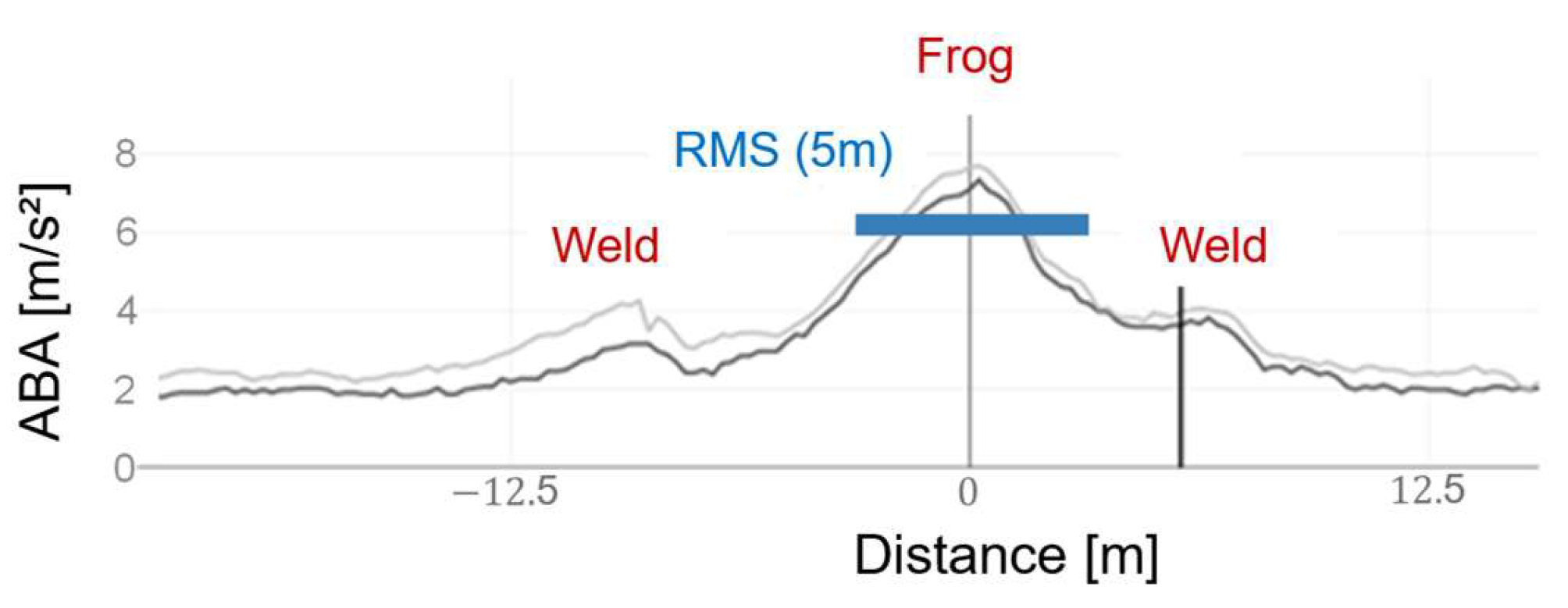 31] show that wheel geometry is one of the dominant predictors of accelerations and forces. As the data used here is from the accelerator mounted on the track-recording car, it can be assumed that the wheels are in good condition, as there are stricter limits and regular inspections for the recording car. (2) Speed has a significant effect on vehicle response. To use axle box accelerations as an indicator of frog condition, it is necessary to eliminate the influence of speed. For this purpose, the method developed by Joanneum Research—based on comparing accelerations from multiple turnout passes at different speeds [