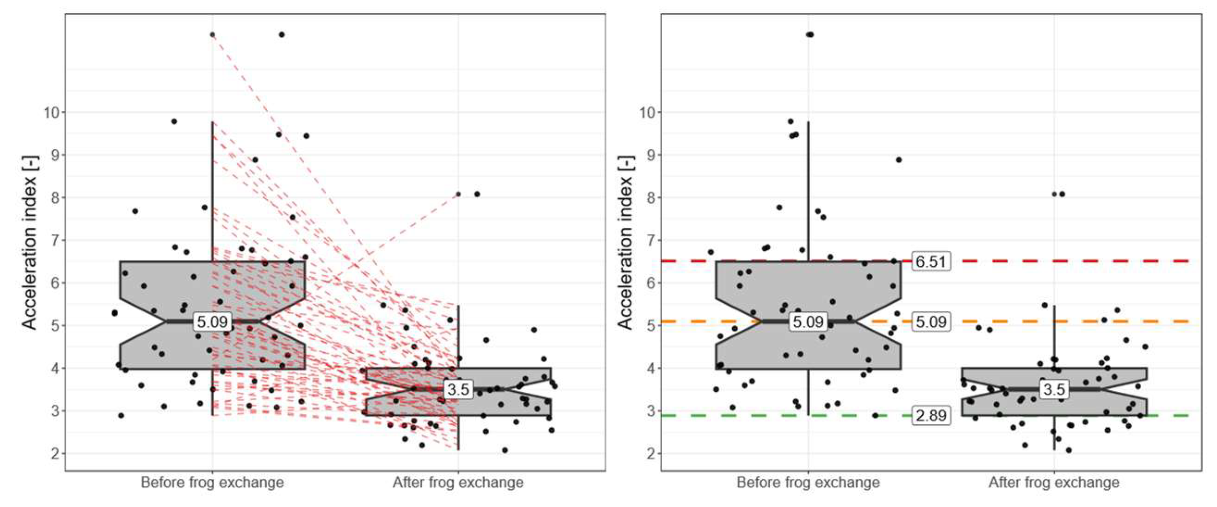 Figure 8 represents the quality before frog exchanges, which is relatively poor, while the right box represents the quality after frog exchanges, which is relatively good. The respective frogs of the same turnout are connected by a dashed red line. The data shows that almost every replacement resulted in a significant improvement in frog quality, which in turn resulted in lower axle box accelerations. A relatively high deviation can be seen for the quality indicators before the frog replacement, while only a few high values remain after the replacement. There are three possible explanations for this: (1) It is possible that several frogs were replaced due to rail defects and cracks. While these are valid reasons for replacement, they are not necessarily the cause of increased accelerations. (2) The data points represent the last measurement run prior to replacement. It is common practice to carry out repair welding before replacing a frog. This may result in slightly lower accelerations for frogs where repair welding is effective. (3) Replacing the frog without addressing the bedding quality may result in increased accelerations after frog replacement.