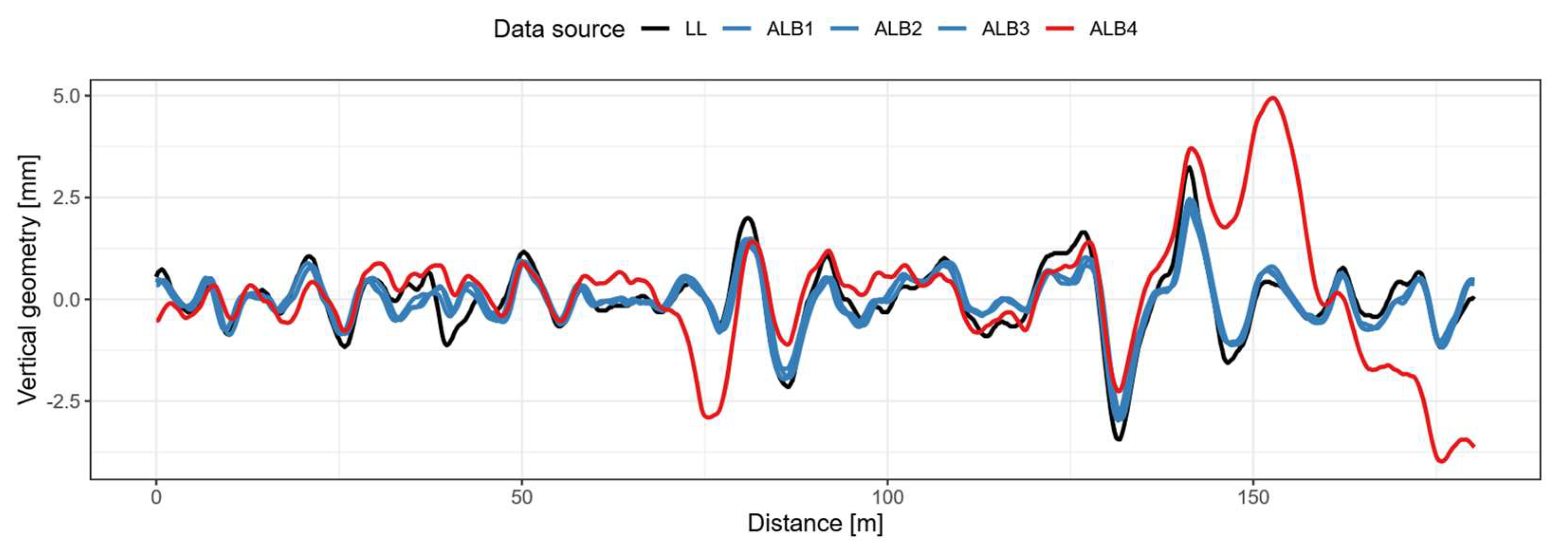 The black line represents the longitudinal level as measured by the track-recording car using an IMU. The coloured lines represent the double-integrated axle box accelerations, filtered to the wavelength range of the longitudinal level (3–25 m). Four measurements from two vehicles are available for comparison. The comparison shows that three of the acceleration signals fit the longitudinal level quite well after double integration. One measurement, the red signal, shows some unexplained deviations. Further applications of the method show that double integration is a reliable approach to approximating the longitudinal level. However, as demonstrated in