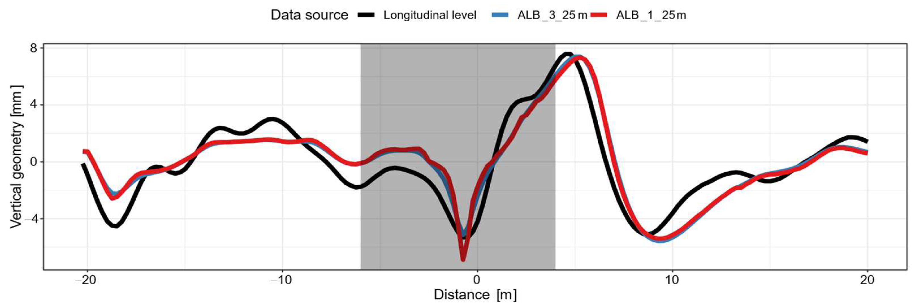 The red line represents the double-integrated acceleration data, including wavelengths from 1 to 25 m. Due to the inclusion of shorter wavelengths, a deeper peak is depicted in the data. This peak corresponds to the short-wave wheel drop in the frog area and is not detectable in the longitudinal level as it includes longer wavelengths only. The use of double-integrated axle box accelerations therefore adds additional information that can be used for evaluation. However, the results are affected by the wavelength range chosen. This is illustrated in