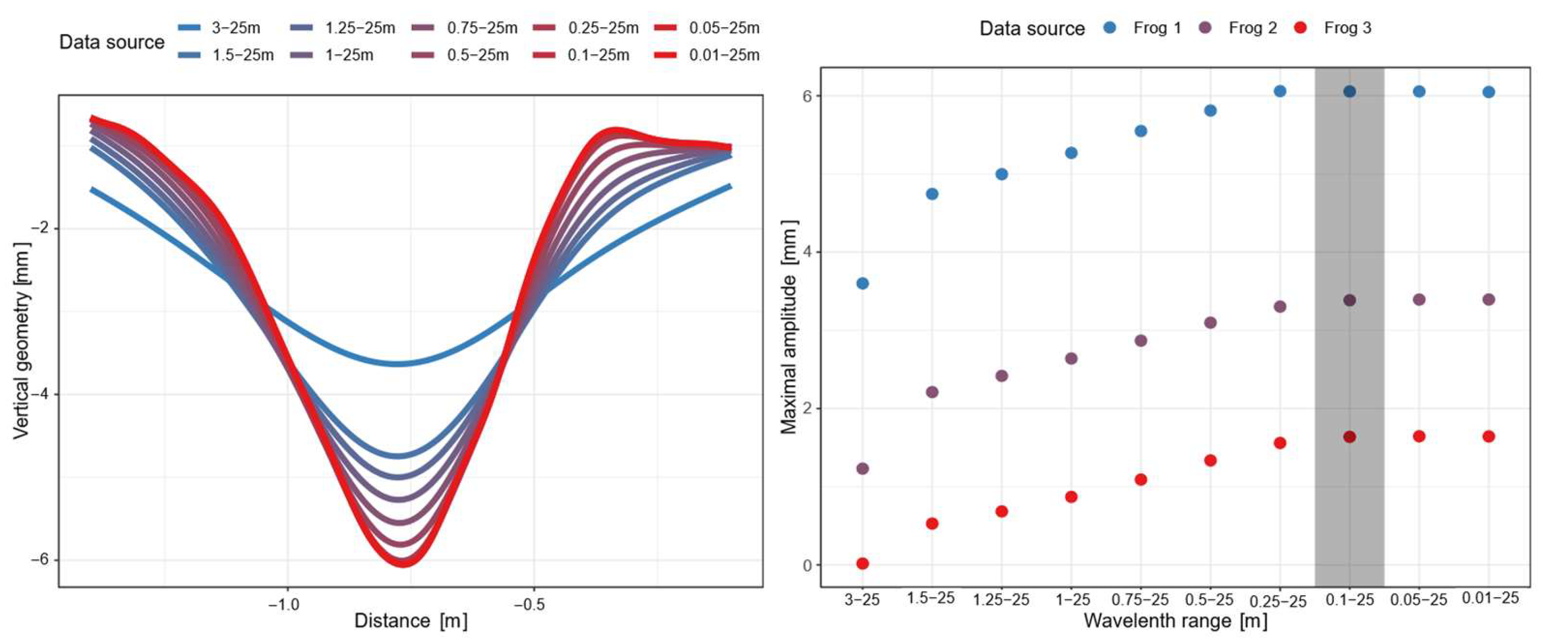 Figure 12, reinforces this observation, indicating that wheel drop amplitudes tend to grow with shorter wavelengths. However, this trend levels off within the minimum wavelength range of 0.1 to 0.25 m. Shorter wavelengths than 0.1 m seem not to contribute to the wheel drop and are therefore not relevant for the load modelling. While this is not the case for the data analysed, data instabilities are more likely for signals including shorter wavelength fractions. Given the lack of additional information within wavelengths below 0.1 m and the increased risk of data instability, data is filtered to 0.1–25 m.