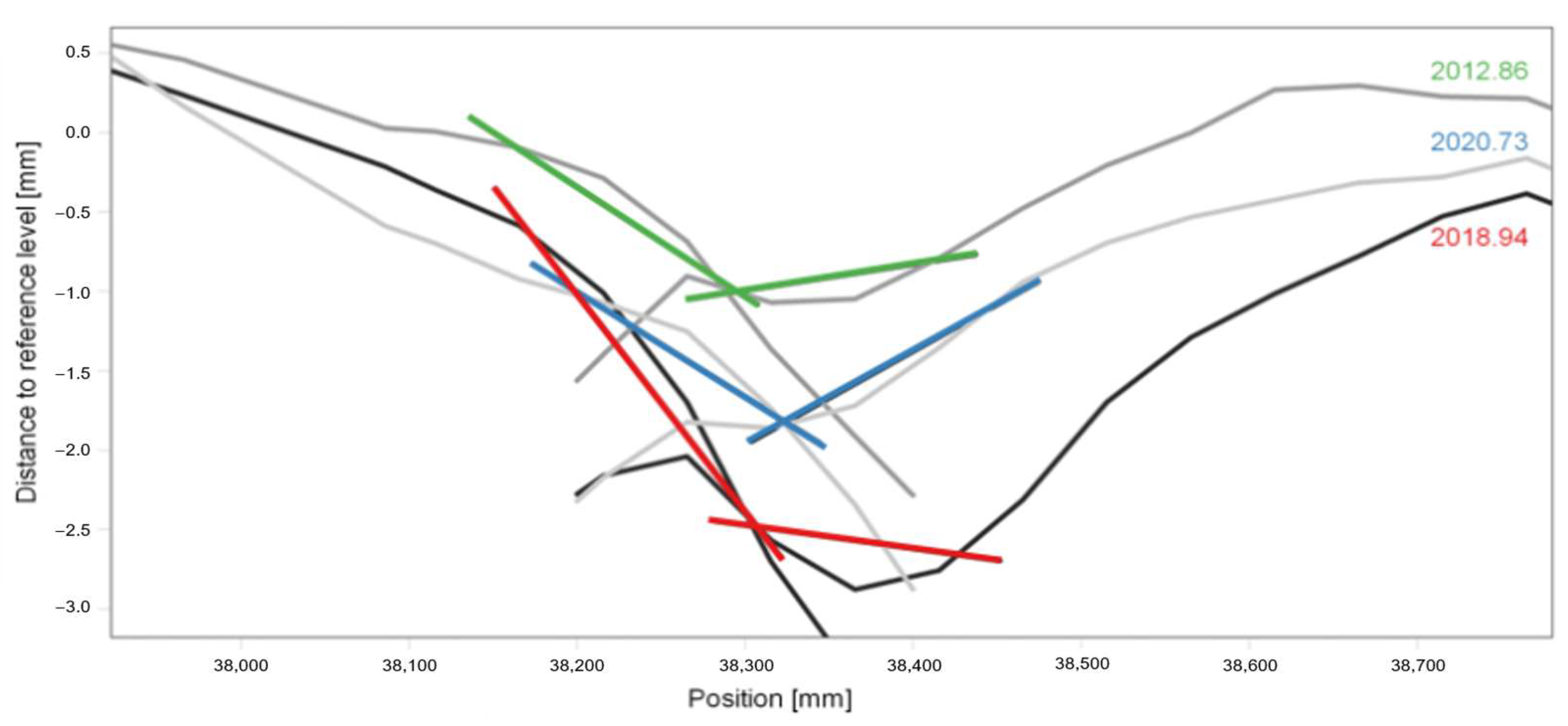 The left (falling) lines represent the geometry of the wing rail, the right (rising) lines represent the geometry of the frog. The upper curves refer to the first measurement after the turnout was renewed, so the frog can be assumed to be in good condition. During operation, the geometry deteriorates, resulting in the lower curves. It is clearly visible that the ramp angle has increased due to the deterioration process. The frog was replaced after 2018, resulting in the geometry shown by the middle curves. Again, the geometry is more symmetrical and the transition of the wheel is smoother. For further interpretation, the geometries need to be linearised. This can be achieved by using linear regressions described by the coloured lines in