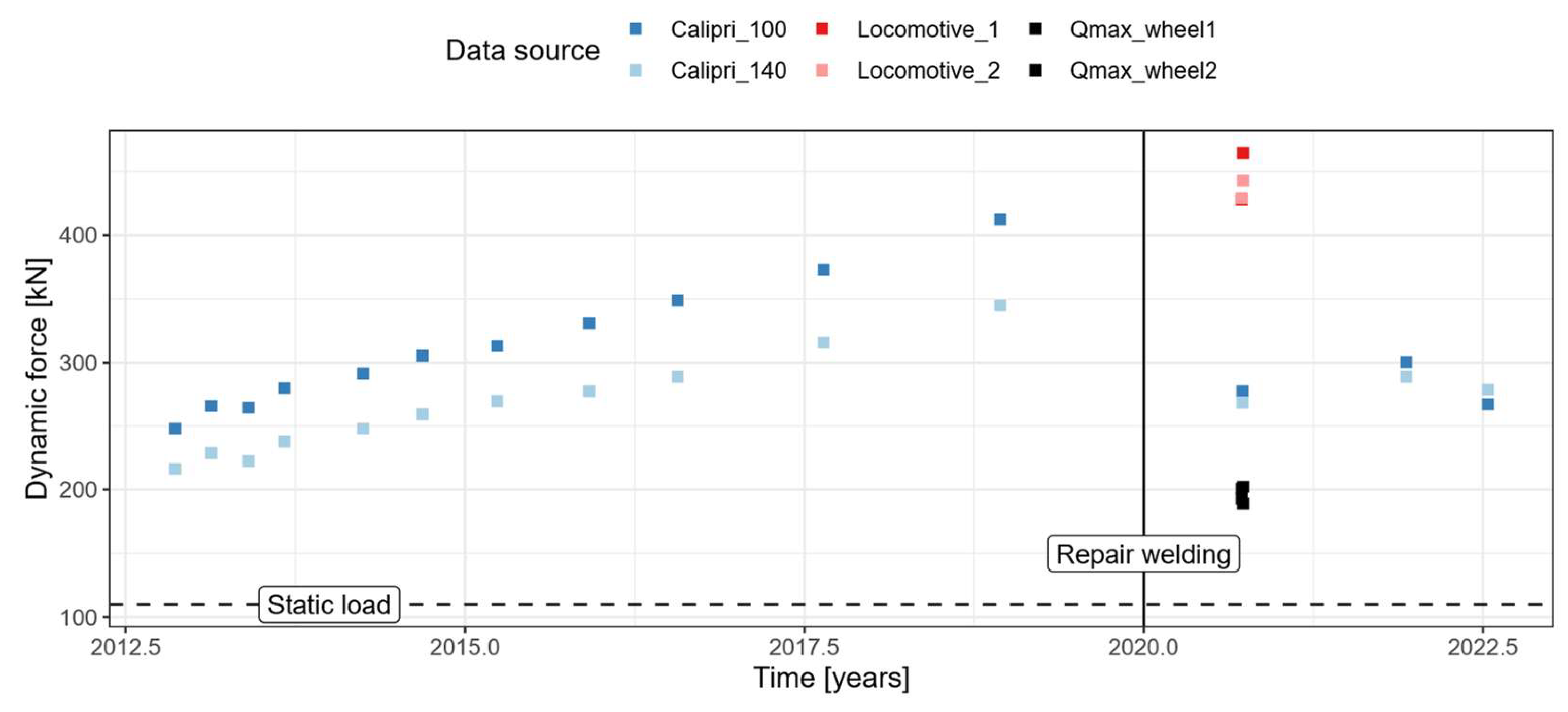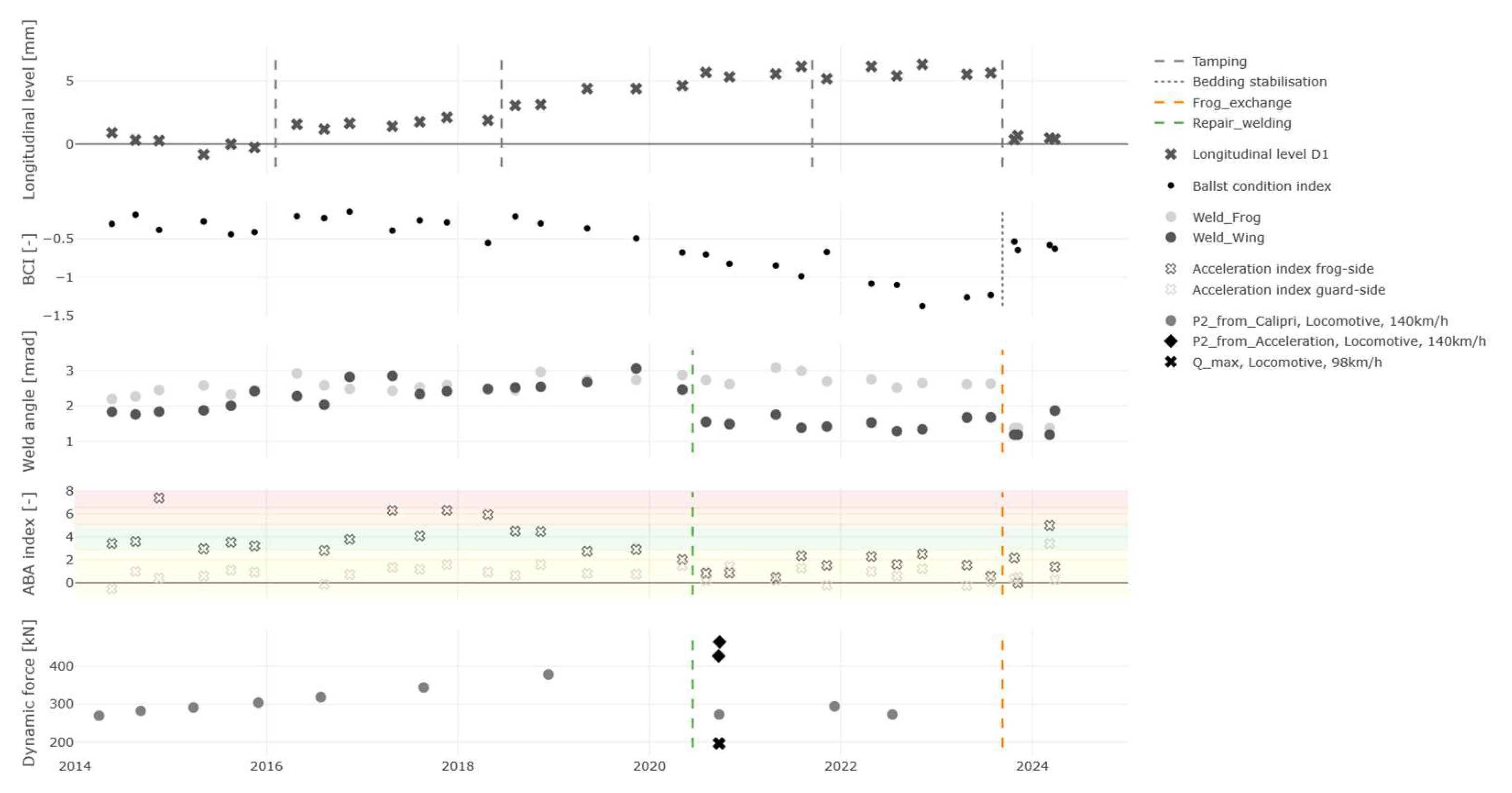 Local measurements are available between 2012 and 2023; therefore, dynamic forces are presented over time. The blue points represent calculated P2 forces when a locomotive passes through the geometry provided by local measurements. As clearly visible, due to wear of the frog and the wing rail, the linearised ramp angle grows over time, leading to P2 forces becoming higher over time. In 2020, a repair welding action repairs the frog geometry and therefore reduces the P2 force level. In mid-2020, in addition to local measurements, ramp angles gained from double-integrated axle box accelerations from two locomotive types with two measurements were available and depicted as red points. Again, the Jenkins model is used for P2 force calculation. As the two locomotives come with similar masses, the P2 forces are comparable. Also, in mid-2020, Q forces provided by a measurement wheel set were available and visualised as black points. As the vehicles passed the frog with a speed of 140 km/h, P2 force calculation also assumed the same velocity. When comparing the force level of the three groups, significant differences appear. Although they all represent dynamic forces, a direct comparison is not technically possible. The lowest force levels (~200 kN) are represented by the measured Q forces. The reason for this is that the measurement principle (wheel set measurement) is limited to frequencies up to 20 Hz. This results in a force signal that filters out high frequency force peaks and therefore reduces the amplitudes of the force peaks, as the highest amplitudes are typically caused by high frequencies on top of lower frequencies. The P2 forces of the Jenkins model represent the 20–100 Hz frequency range. Therefore, Q forces from wheel set measurements clearly underestimate the force peaks relevant to ballast damage.