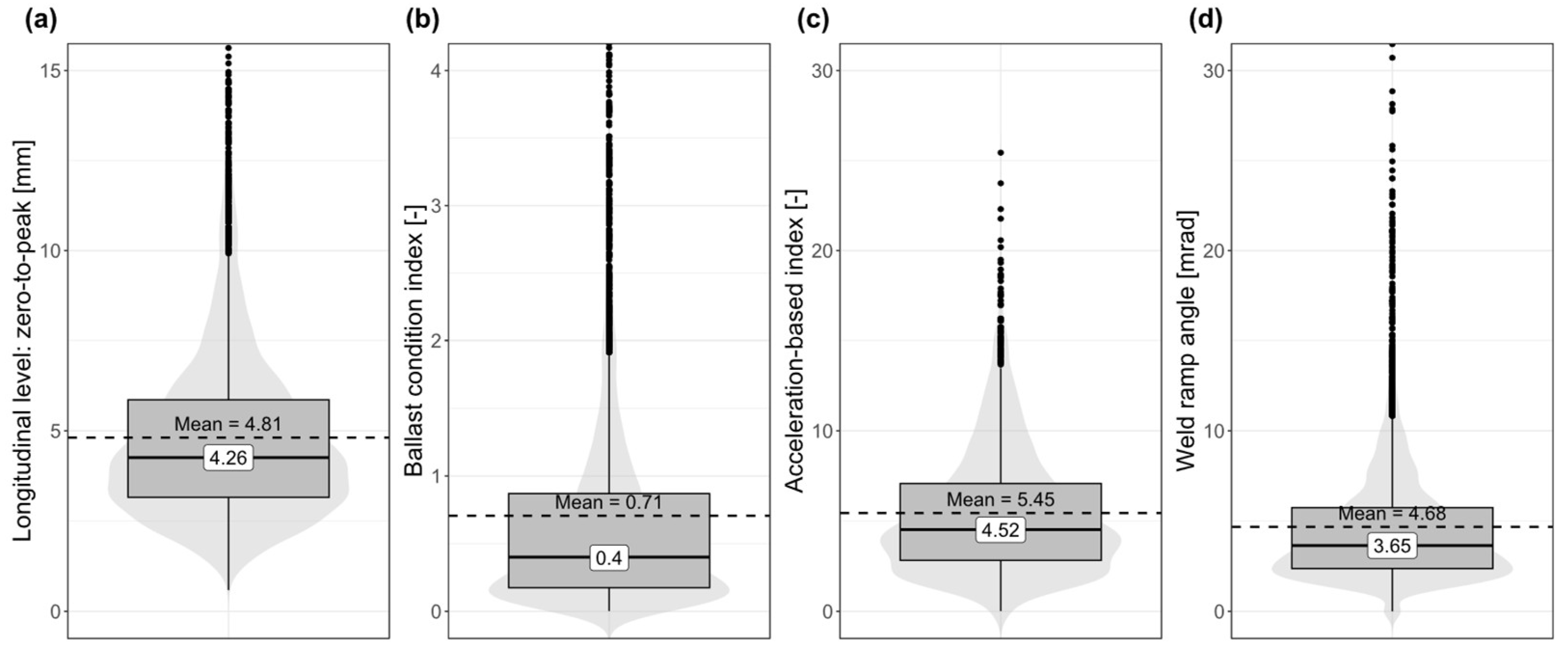 26] provide examples on the possibilities of the technology. However, image recognition alone is not expected to be sufficient, as not all cracks are visible from above, so ultrasonic testing will still be required in the future. While all the other proposed quality indicators will be evaluated in detail, image recognition is not part of this study. The six approaches proposed are interrelated and need to be analysed together. However, each approach requires different data sources and data processing. Therefore, each approach is described in detail and finally summarised in a common datasheet. Since track geometry is the most widely used indicator in track quality assessment, we selected it as the first approach.