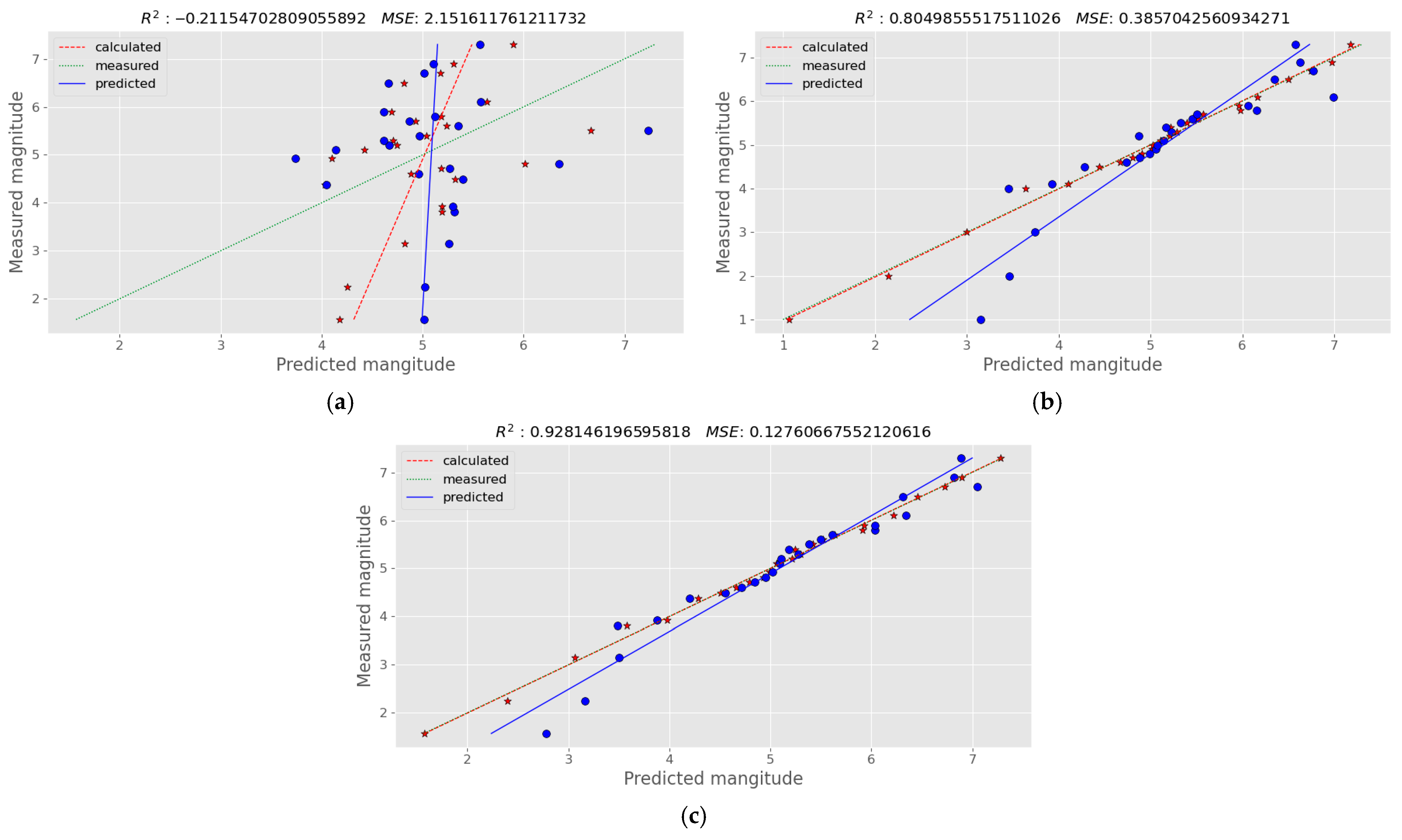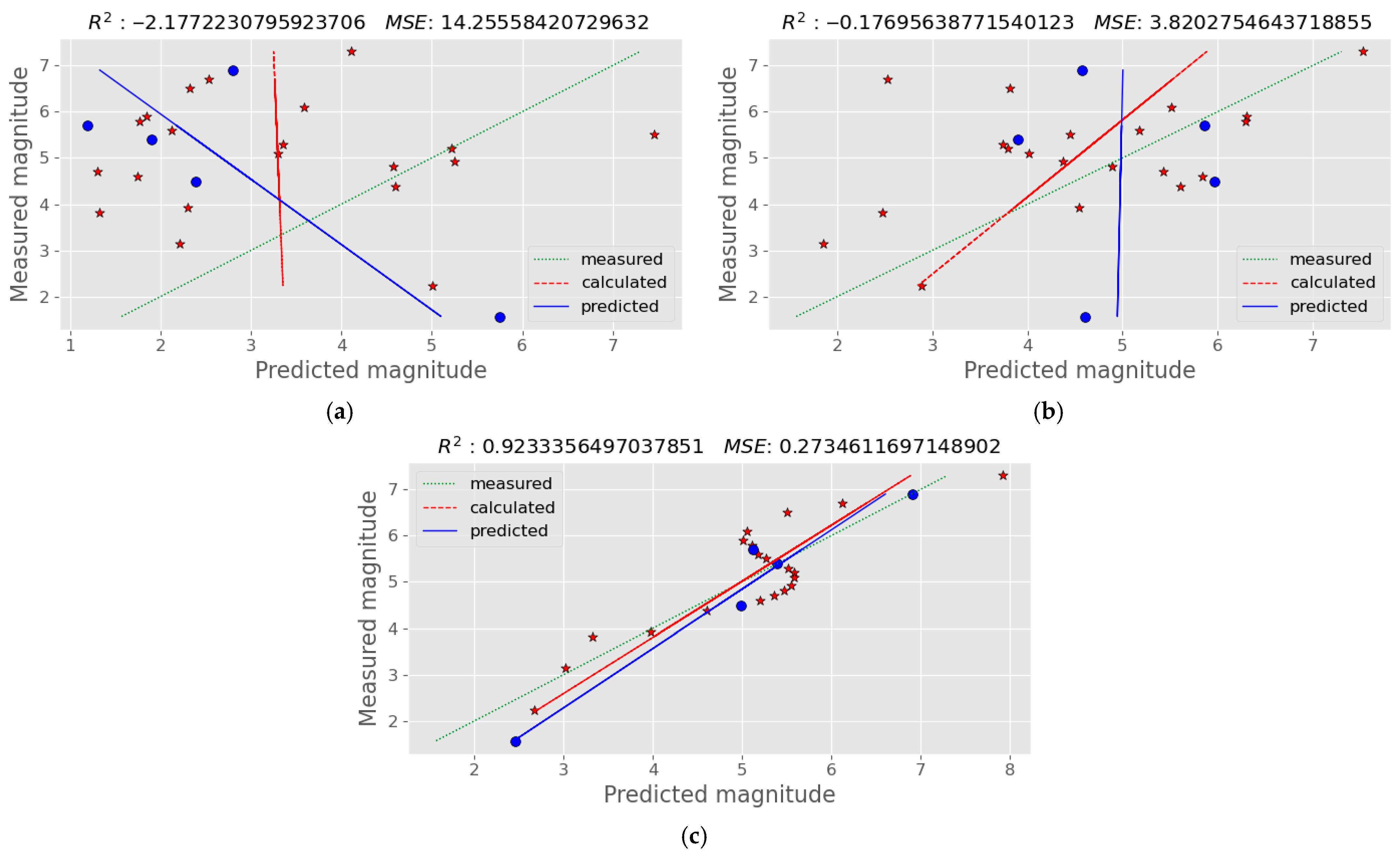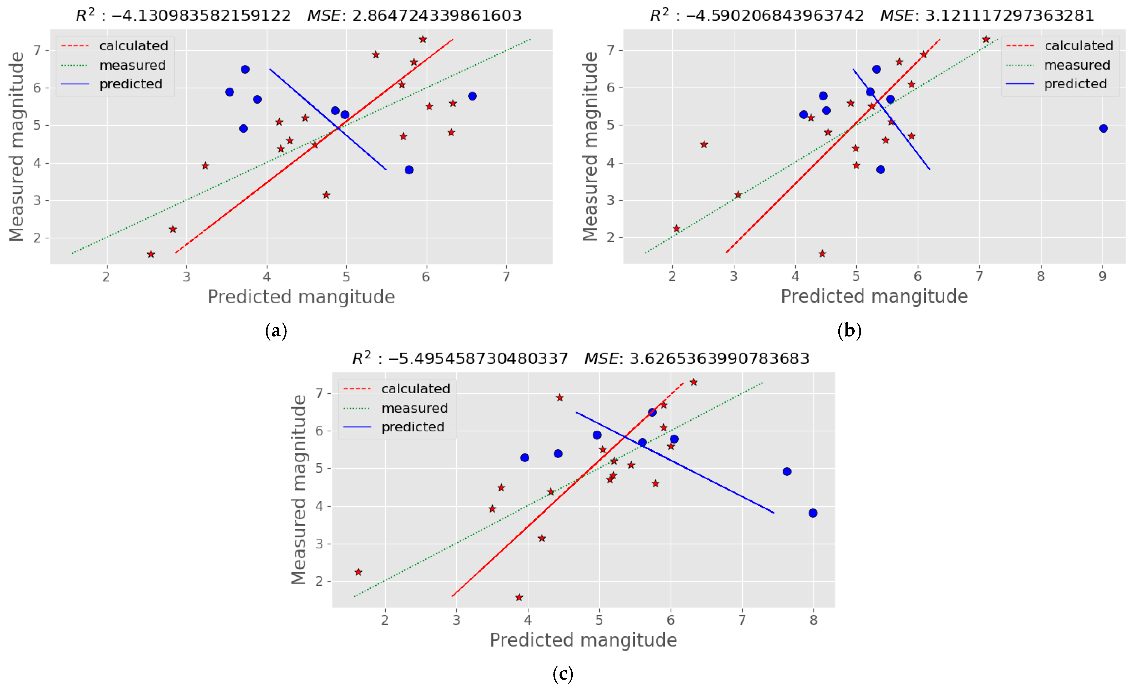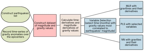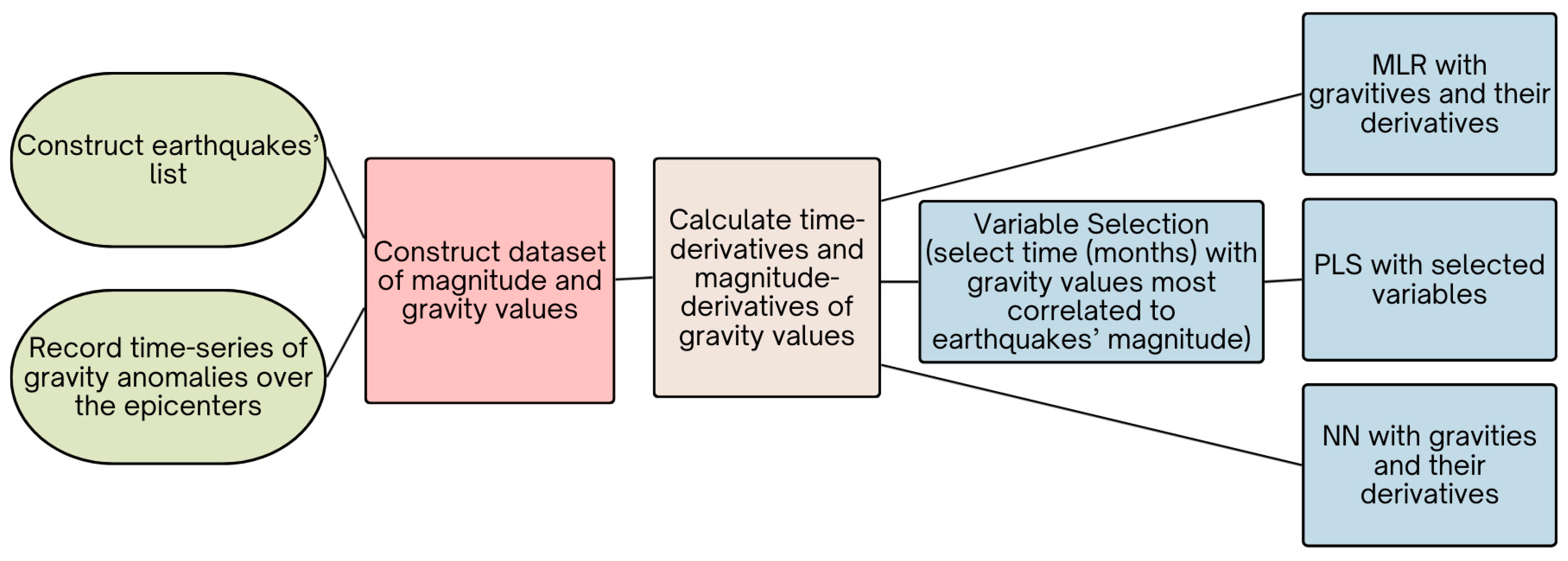 Data scaling by using the Standard scaler () function of the Scikit-learn 1.7.1 library. Calculation of derivatives by using the SavgolFilter () function of the Scipy 1.16.1 library. Calculation of the slope of gravity values through the months, by using the LinearRegression.fit () function of the Scikit-learn 1.7.1 library. | Used as callable function. Regression: linear. Test size: 0.3 Performance metrics: MSE, R2 score. Plotting predicted against actual magnitudes. | Used as callable function Number of components: The optimal determined by variable selection. Model regression function: PLS regression Metrics for evaluation of model performance and prediction: MSE, R2 score Plotting predicted against actual magnitudes | Used as callable function. Keras 3.10.0 model: sequential, regression. Test size: 0.2 Input shape: 10 Input layer: 10 nodes, activation: relu Hidden layers: one layer of three nodes, activation: relu Output layer: one node, activation: linear 200 epochs, batch size: 3 Performance metrics: MSE, R2 score Plotting predicted against actual magnitudes |