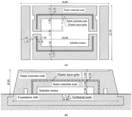 A composite bunker: (a) sectional plan; (b) vertical section (adapted from [2]). All dimensions are in m.