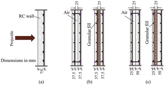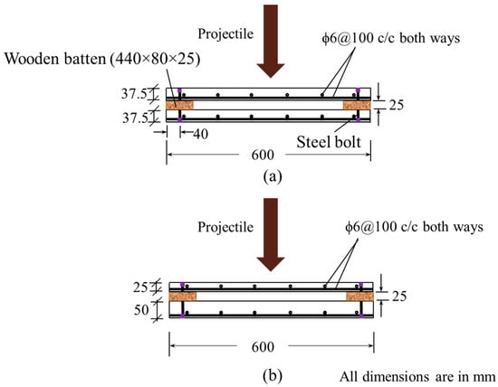 All test specimens were constructed using 6 mm diameter steel rebars of identical grade. The reinforcement was arranged such that the projectile, striking at the center of the target, would not directly impact the rebars. The specimens in the second group featured identical front and back wall thicknesses across all samples, but varied in the type of granular filling materials used. Each specimen was composed of two reinforced concrete walls, each with a thickness of 37.5 mm, representing half the thickness of the control specimen. Both the inner and outer walls were reinforced with ϕ6 plain mild steel bars, spaced at 100 mm center-to-center, maintaining an equivalent total reinforcement to that of the control specimen (Figure 5a). In each wall, the reinforcement was positioned on the rear face with a clear cover of 6.5 mm. A 25 mm gap was provided between the two walls in the test specimens, which was filled with one of two materials: (i) sand compacted at its optimum moisture content, or (ii) recycled concrete aggregate (RCA).