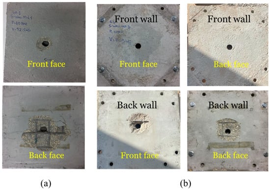 Failure patterns of (a) monolithic wall and (b) composite wall system (equal thickness, without infill) subjected to a projectile impact at a velocity of 92.5 m/s.