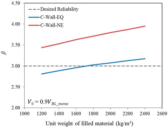 A wide range of options is available to fill the gap between the front and rear walls with various lightweight or normal-weight materials. In the experimental study, we filled the gap between the front and rear walls either with sand (unit weight = 1600 kg/m3) or RCA (unit weight = 1700 kg/m3). In order to examine the influence of filling materials of different unit weights, this parametric investigation involved altering the unit weight within the range of 1200 to 2400 kg/m3. The findings of this study are illustrated in Figure 10. This figure illustrates the vital role of the filling material type. When the filling material is lightweight (unit weight less than 1600 kg/m3), the present composite wall system with equally thick front and rear walls possesses a reliability value less than the minimum required level of safety. However, the reliability index is more than the minimum required value for unequal-thickness composite wall systems, even when the filling material is lightweight.