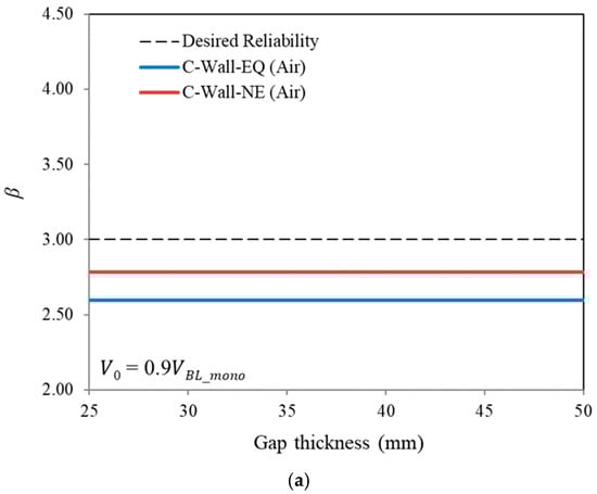 If the space between the two walls is filled with air rather than any material, it does not impact the safety performance of the composite wall system. This is illustrated in Figure 11a. However, Figure 11b demonstrates that when the gap is filled with a material such as sand, its thickness influences the reliability of the composite wall system. In this scenario, the reliability improves in a nearly linear fashion as the thickness of the filled gap increases. This is because a thicker-filled gap will cause the projectile to dissipate more energy before striking the rear wall. Due to this energy dissipation, the projectile will hit the rear wall with lesser velocity, leading to a higher ballistic threshold for the composite wall system and, consequently, greater system reliability.