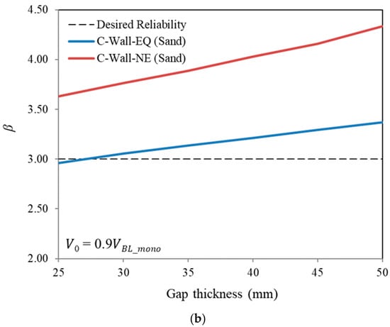 Influence of gap thickness on the reliability of the composite wall system when: (a) no filling in the gap, and (b) the gap is filled with sand.