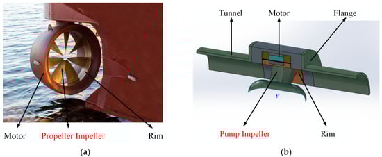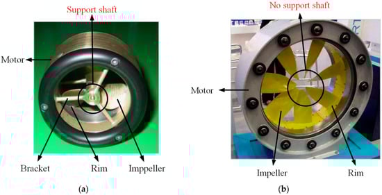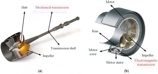 The “rim” in the rim-driven device (RDD), also known as rim-driven propeller (RDP) and rim-driven thruster (RDT), generally refers to the impeller rim. The impeller is a widely used energy conversion component in machinery, such as pump impellers and propeller impellers [1,2]. Ordinary impellers are usually driven by the engine through the transmission shaft and the hub, as shown in Figure 1a. This is a mechanical transmission method. The impeller of the RDD, however, is directly driven by the motor through the rim, thus eliminating the need for a transmission shaft. The motor rotor and the impeller rim are integrated, while the motor stator and the motor rotor achieve non-contact electromagnetic transmission through the air gap, as shown in Figure 1b. The RDD can achieve shaftless, modular, and integrated operation of the turbomachinery system, and has broad application prospects [1,2,3].