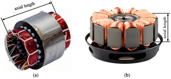 The armature winding end of a common motor is trumpet-shaped, which occupies a relatively large axial space, as shown in Figure 4a. The end winding structure of the fractional slot concentrated winding motor is simple, and the axial length of the motor is relatively small [14,15], as shown in Figure 4b.
