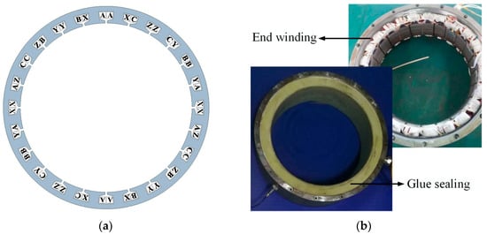 The arrangement of the three-phase windings is shown in Figure 5a. In the figure, coil sides A and X belong to the A-phase windings, coil sides B and Y belong to the B-phase windings, and coil sides C and Z belong to the C-phase windings. The currents in coil sides X, Y, and Z are equal in magnitude but opposite in direction to those in coil sides A, B, and C. Since the RDD operates in water, the windings are sealed with glue, as shown in Figure 5b.