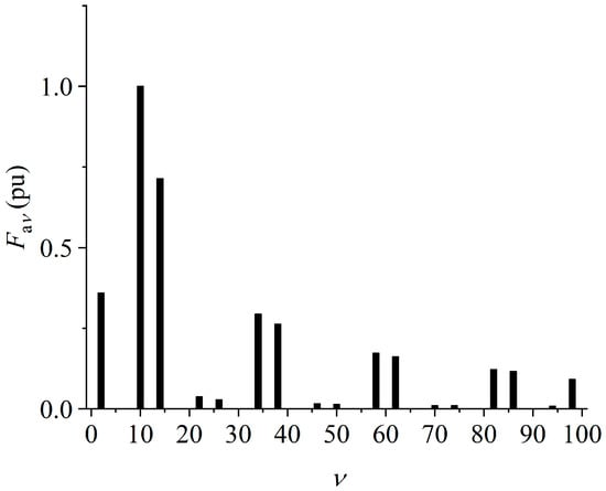 The per-unit value of the armature harmonic magnetomotive force of the 24-slot 20-pole fractional slot concentrated winding is shown in Figure 6, where represents the number of magnetomotive force pole pairs and represents the per-unit value of the magnetomotive force.