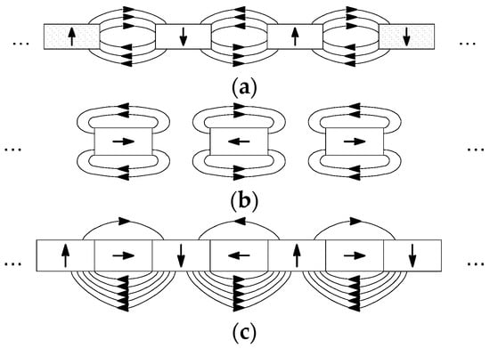 Permanent magnet arrangement: (a) opposite polarity permanent magnets are alternately arranged (radially magnetized); (b) opposite polarity permanent magnets are alternately arranged (tangential magnetization); (c) Halbach permanent magnet array.