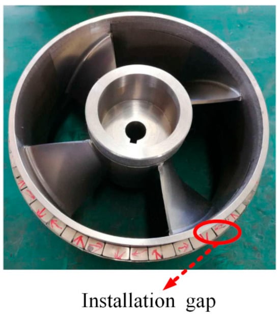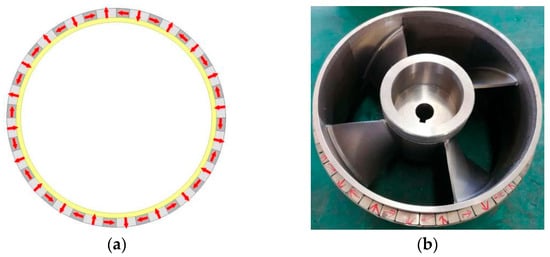 The permanent magnet motor rotor of an RDD usually operates in a water medium. The impeller blade and rim ring are generally made of anti-corrosion stainless steel, and to ensure the strength of the rotor, the stainless steel rim should have a certain thickness. The magnetic permeability of stainless steel is much lower than that of ferromagnetic materials. Meanwhile, for smooth operation of the RDD, the thickness of the rotor should be as small as possible. Therefore, in this paper, the rotor does not use conventional ferromagnetic materials. Instead, a coreless Halbach permanent magnet array rotor scheme is formed by combining a Halbach permanent magnet array with a unilateral magnetic clustering effect and a stainless steel rim ring. Each single permanent magnet is magnetized in parallel. The arrangement of the permanent magnets is shown in Figure 8, with arrows indicating the magnetization direction.