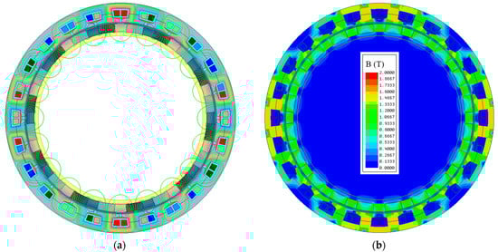 Magnetic field distribution of the permanent magnet motor for a rim-driven device: (a) magnetic field lines; (b) magnetic flux density.