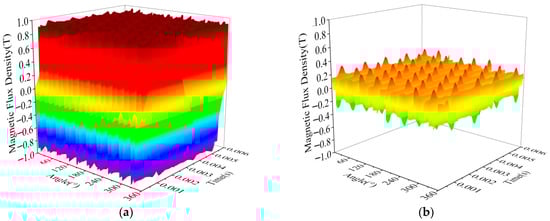 Although Figure 10 reflects the spatial distribution characteristics of the motor’s air gap magnetic flux density, it cannot reflect the variation of the air gap magnetic flux density with time. The obtained air gap magnetic flux density distribution is only the air gap magnetic flux density distribution at a specific pole slot relative position at a certain moment. In fact, since the relative positions of the magnetic poles and stator teeth are different at different times, the air gap magnetic field distribution will also be different.