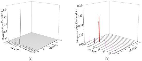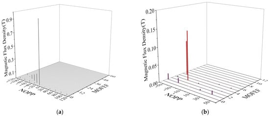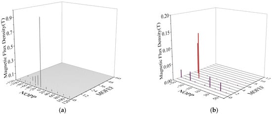 After considering the harmonic current, no obvious difference is observed in the comparison between Figure 16a and Figure 18a. However, it can be seen from the comparison between Figure 16b and Figure 18b that the harmonic current did not introduce new harmonic components, but it increased the amplitudes of the magnetic flux densities with , which have very small amplitudes when only considering the fundamental current. These components are mainly the result of the interaction between the harmonic magnetomotive force with relatively small NOPP generated by the harmonic current with and the constant specific magnetic permeability, which is consistent with the theoretical analysis in the previous text. Therefore, for the harmonic magnetic field generated by the harmonic current of the motor, the magnetic field component produced by the interaction between the harmonic magnetomotive force with a small NOPP and a large amplitude generated by the harmonic current and the constant air gap specific magnetic permeability should be mainly considered. Other harmonic magnetic field components with smaller amplitudes can be disregarded. Meanwhile, the comparison between the radial magnetic flux density and the tangential magnetic flux density once again indicates that even when considering the harmonic current, the NOPP and the MOFEF of the tangential and radial air gap magnetic flux density harmonics under the load state are exactly the same, and the harmonic amplitudes of the tangential magnetic flux density and the radial magnetic flux density do not differ much.