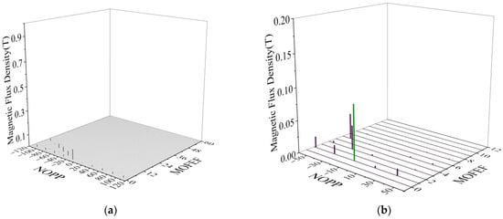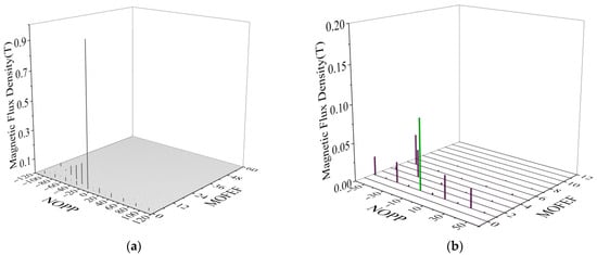 By comparing Figure 12 with Figure 13, it can be found that the NOPP and frequency components of the radial and tangential components of the air gap magnetic flux density under no load are exactly the same, verifying the analysis of the relationship between the radial and tangential magnetic flux density of the air gap in the previous text—that is, the tangential magnetic flux density harmonic always occurs along with the radial magnetic flux density harmonic, they have a phase difference of only 90°, but the NOPP and the MOFEF are the same. Furthermore, by comparing Figure 12a with Figure 13a, it can be found that the fundamental () amplitudes of the radial and tangential components of the air gap magnetic flux density under no-load conditions differ significantly, approximately 10 times. By comparing Figure 11b with Figure 12b, it can be found that the harmonic amplitudes of the radial and tangential components of the air gap magnetic flux density under no-load conditions do not differ much.