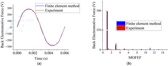 After obtaining the magnetic field distribution at different times based on the finite element method, the variation of the back electromotive force of the motor with time can be calculated from the difference quotient of phase flux linkage with respect to time. To verify the validity of the finite element method for calculating the electromagnetic field of the motor in this paper, an experiment was conducted on a 24-slot 20-pole rim-driven prototype. The comparison of the measured and finite element method-calculated back electromotive force is shown in Figure 14.