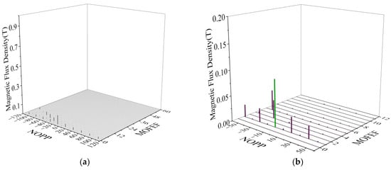 It can be seen from Figure 16a that after considering the fundamental current, the change in the harmonic magnetic flux density generated by the magnetic poles with is not significant. However, the harmonic magnetic flux densities with , and increase significantly. These harmonic components are the results of the interaction between the harmonic magnetomotive force with small NOPP and large amplitude generated by the armature of the 24-slot 20-pole motor in Figure 6 and the constant air gap specific magnetic permeability, verifying the theoretical analysis of the harmonic components of the air gap magnetic field considering the fundamental current in the previous text. Therefore, for the harmonic magnetic field generated by the fundamental current, the magnetic field component produced by the interaction between the harmonic magnetomotive force with a small NOPP and a large amplitude generated by the fundamental current and the constant air gap specific magnetic permeability should be mainly considered. Meanwhile, the comparison between Figure 16 and Figure 17 also verifies that the NOPP and the MOFEF of the tangential and radial air gap magnetic flux density harmonic under load conditions are exactly the same. Except for the fundamental amplitude, the harmonic amplitudes of the tangential magnetic flux density and the radial magnetic flux density do not differ much.