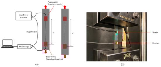 The general configuration of the measurement system is illustrated in Figure 1a, which also demonstrates how the specimen elongates under tensile stress. A photograph of the specimen inside the tensile test rig is presented in Figure 1b, where the attached sender and receiver PETs on the specimen are clearly visible.