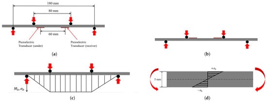 Four-point bending setup: (a) PETs positioned at the bottom, measuring maximum tensile stress. (b) PETs positioned at the top, measuring maximum compressive stress. (c) Stress distribution in the specimen under bending. (d) Stress profile across the specimen thickness.