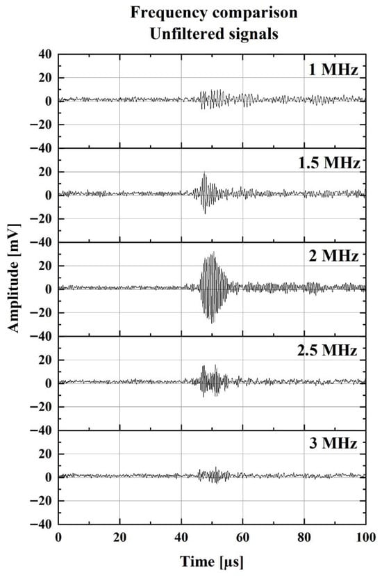 Initially, the influence of the excitation frequency on the system response was investigated. It was observed that, due to the characteristics of the measurement setup and the specimen geometry, certain frequencies yielded significantly stronger responses than others. This behavior is illustrated in Figure 4, which shows the received signals for a range of excitation frequencies.
