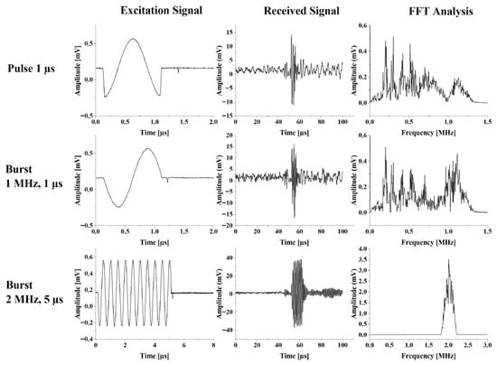 In addition to excitation frequency, the duration of the burst signal significantly influences the quality of the received signal. To investigate this effect, three excitation signal configurations were tested on the specimen: (1) a single pulse signal with a duration of 1 μs; (2) a 1 MHz short burst signal with a total duration of 1 μs; and (3) a 2 MHz burst signal with a longer duration of 5 μs. The excitation and received signals, along with the corresponding fast Fourier transforms (FFT) of the received signals, are presented in Figure 5.