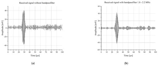 Application of a band-pass filter to clean up the signals: (a) A sample raw received signal generated by a 2 MHz burst via the sender PET. (b) The same signal after band-pass filtering with lower and upper cut-off frequencies of 1.8 and 2.2 MHz, respectively.