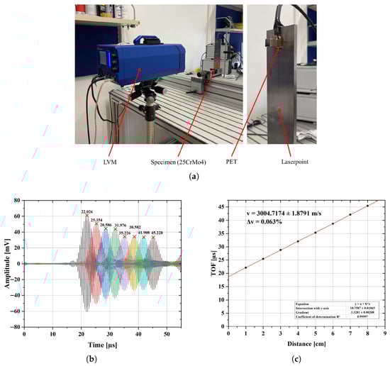 To determine the stress-free SAW velocity and the system’s time offset, a setup was assembled consisting of a signal generator, an oscilloscope, a PET mounted on the specimen as the excitation source, and a laser vibrometer (LVM) for signal detection, as shown in Figure 7a. The height of the LVM was finely adjustable, enabling precise measurement of the time of flight (ToF) at multiple positions along the specimen surface. Measurements were performed at distances ranging from 1 to 8 cm from the PET. The filtered received signals are shown in Figure 7b, where the detected peak positions indicate an increasing ToF trend with distance. These ToF values are plotted in Figure 7c, confirming a linear relationship, which indicates a constant SAW velocity. A linear fit yields a slope with units of time per distance, whose inverse corresponds to the SAW velocity. Based on the fit, the wave velocity was calculated as m/s, and the y-intercept gives a system time offset of μs.
