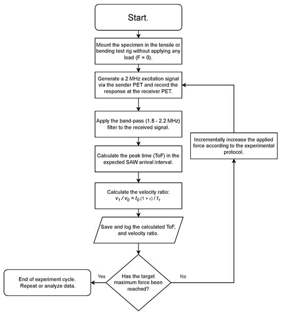 The process begins with mounting the specimen in the test rig, followed by exciting the sender using the selected excitation signal, viz., a 2 MHz sinusoidal wave with a duration of 5 μs. The corresponding response is recorded at the receiver.