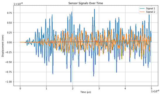 Finite element simulations are conducted to develop an evaluation routine for specifically separating the individual wave modes from the detected data. The sample geometry and signal shape are selected to be identical to those used in the experimental test. Typical values for steel are used as material parameters. Two virtual sensors are placed at a defined distance on the numerical model in order to measure the elastic wave. Figure 10 shows the signals at the two sensor positions, whereas Figure 11 shows the determination of the temporal shift of the Rayleigh wave using cross-correlation.