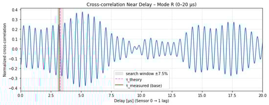 To separate the wave modes, the two sensor traces are first band-pass filtered around the excitation band and trimmed to identical length. Using the material parameters E (Young’s modulus), (Poisson’s ratio), and (mass density), the target phase velocities for isotropic steel are computed for the longitudinal, shear, and Rayleigh modes, i.e., , , and . These velocities are converted into expected arrival times for each mode (with sensor spacing d), and narrow time windows are placed around each . Within every window, the inter-sensor delay is estimated by the Generalized Cross-Correlation with Phase Transform (GCC–PHAT) applied to the two band-limited signals; the peak whose delay is closest to is selected. The corresponding apparent velocity is then compared against the targets , and the mode label is assigned to the one with the smallest relative deviation. The assignment is further corroborated in the frequency domain by evaluating the cross spectrum of the two sensors: from the unwrapped inter-sensor phase, one obtains the wavenumber and the frequency-dependent phase velocity ; coherent plateaus of near , , or confirm the classification. This procedure robustly separates Rayleigh, longitudinal, and shear contributions using only the two synchronized sensor recordings. More detailed information on this methodology can be found in the following references [29,30,31].
