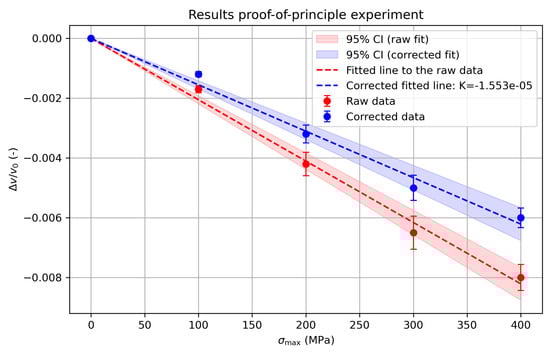 Results of the proof-of-principle experiment. Velocity changes due to the applied tensile stress (red: uncorrected, blue: corrected for distance changes due to the resulting stress).