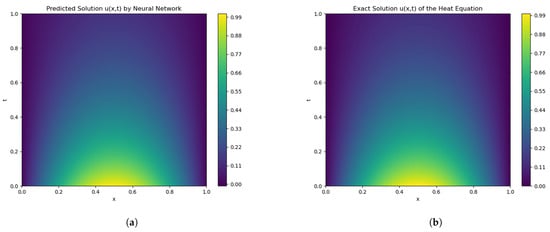 here, denotes the temperature distribution over a spatio-temporal domain, and the thermal diffusivity is taken as . The initial condition is sinusoidal, and the boundary conditions are homogeneous Dirichlet type, representing a rod held at zero temperature at both ends. This problem admits an exact analytical solution given by [25]