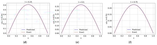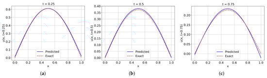 Figure 9 provides a detailed validation of the predicted solutions by comparing one-dimensional slices of the solution surface at fixed spatial and temporal positions. For the standard PINN, the predicted curves capture the overall trend but deviate from the exact solutions, particularly around the peak regions where amplitudes are overestimated. These discrepancies become more pronounced with . In contrast, GVW-PINN achieves nearly perfect agreement with the analytical solutions across the tested cases. The red dashed lines almost overlap with the black solid lines, indicating that gradient variance weighting effectively balances the training dynamics and enhances the model’s generalization.