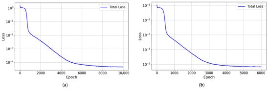 Training loss curves for the Helmholtz equation. (a) Loss curve of the standard PINN. (b) Loss curve of the GVW-PINN.