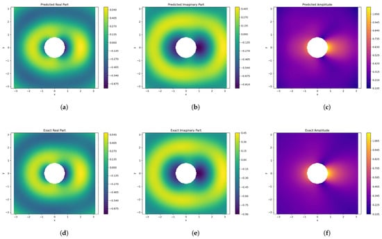 Density plots of the acoustic field components for the two-dimensional Helmholtz equation with a sound-hard circular obstacle. (a–c) show the predicted real part, imaginary part, and amplitude obtained by GVW-PINN, while (d–f) present the corresponding exact analytical solutions.