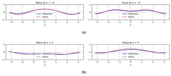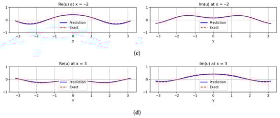 Figure 6 shows cross-sectional comparisons at fixed x values (). The standard PINN fails to accurately capture the real and imaginary components, particularly near the boundaries, exhibiting noticeable deviations, minor oscillations, and phase shifts, which are common failures in high-frequency wave simulations. In contrast, the GVW-PINN predictions align almost perfectly with the analytical solution, producing smooth and stable numerical results across the entire domain. This demonstrates that the gradient-variance weighting mechanism significantly enhances accuracy and training stability.